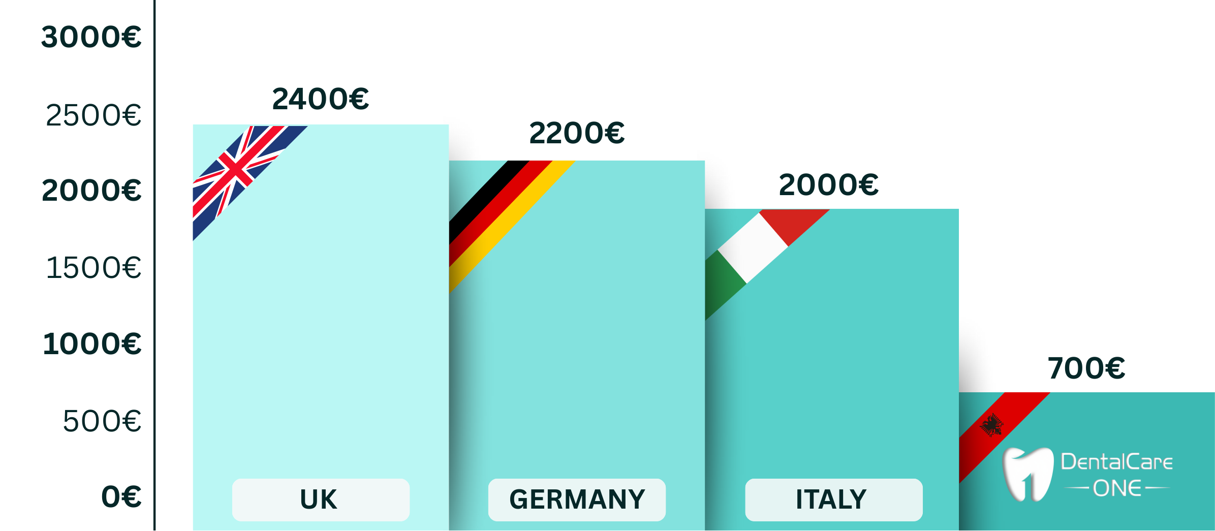 Dental implants in Albania cost up to 70% less than in the UK, Italy, or Germany, without compromising quality.